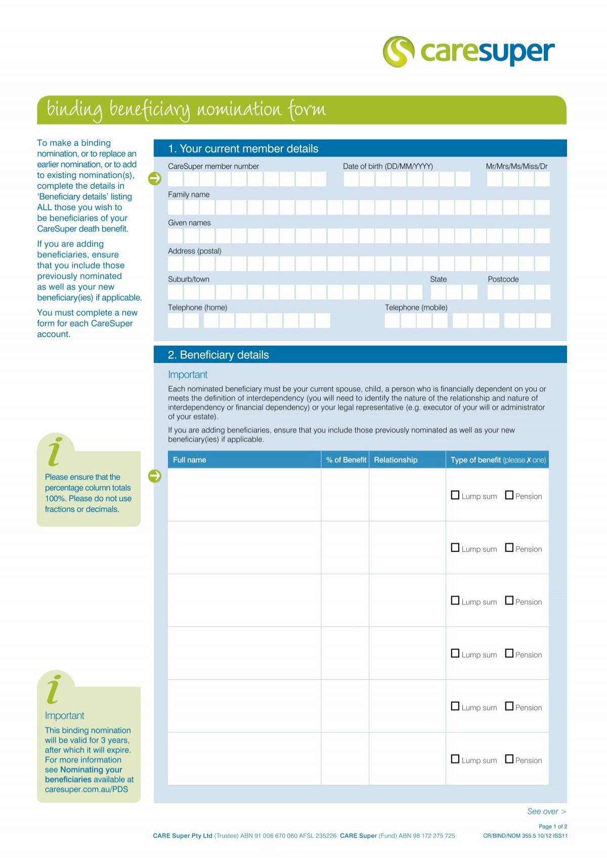 - **Specificity:** Clearly state the full names of your beneficiaries and the exact percentage of your super benefit each should receive.