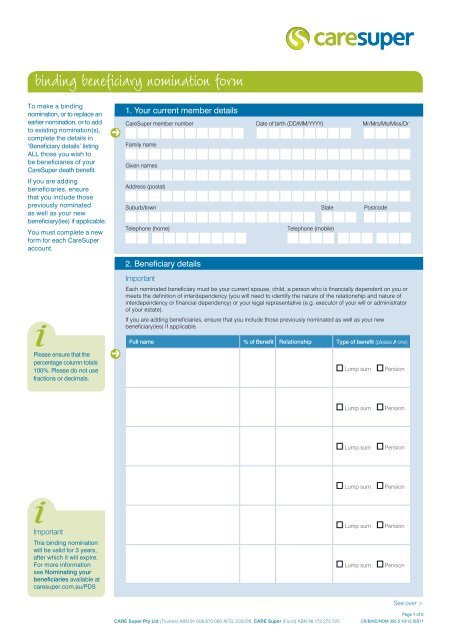 Upon receiving the form, take your time to read through all instructions carefully. Accuracy is key. You will need to provide your full name, member number, and details of your chosen beneficiaries. For each beneficiary, this typically includes their full name, date of birth, relationship to you, and the percentage of your super benefit you wish them to receive. Ensure the percentages add up to 100%. Any ambiguity or incorrect details could lead to delays or, in the worst-case scenario, the nomination being deemed invalid.