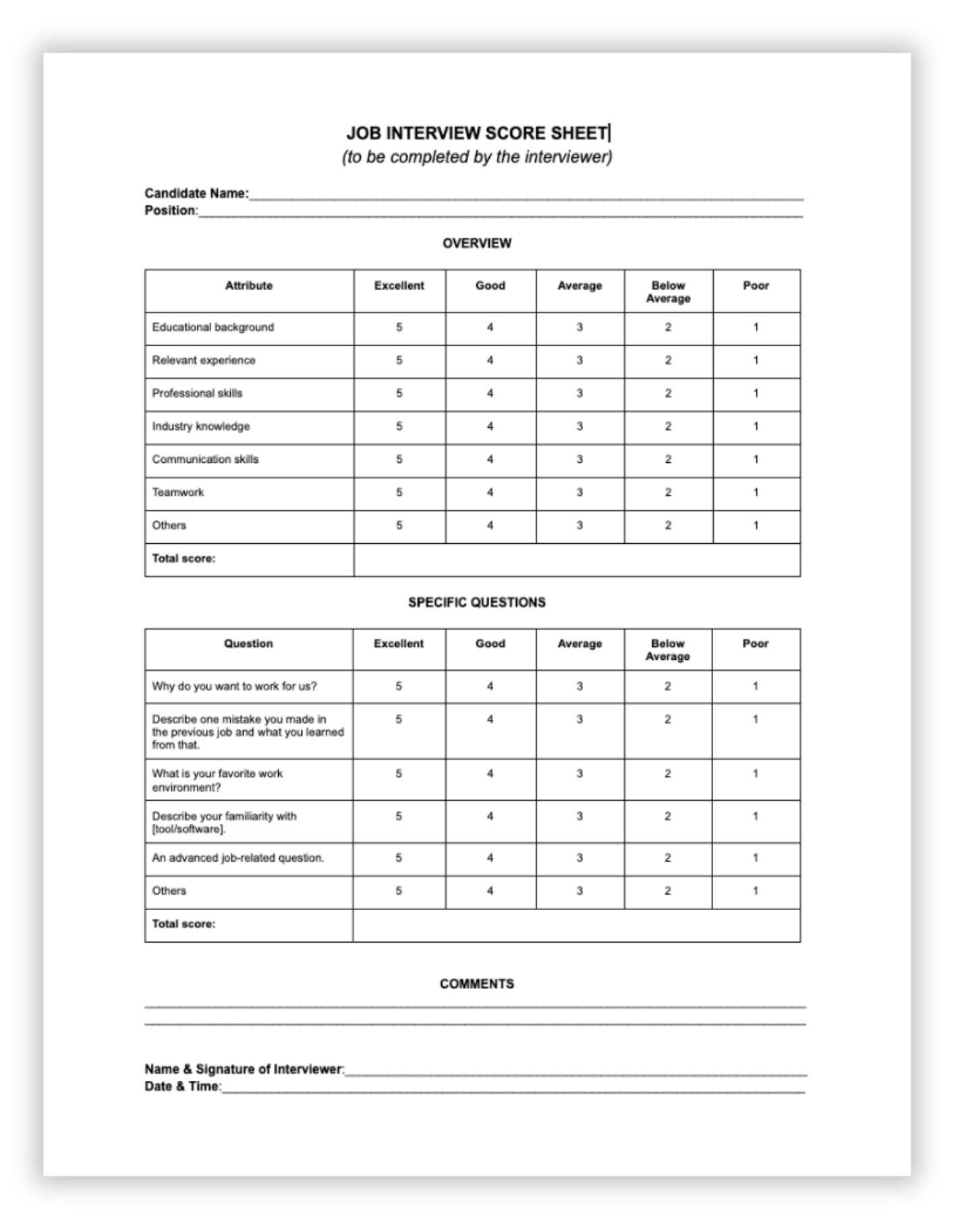 Consider the type of rating scale you’ll use. A simple numerical scale (e.g., 1-5, where 5 is excellent) is often effective, but ensure each number is clearly defined so evaluators understand what constitutes a "3" versus a "4." Beyond numerical ratings, always include sections for open-ended comments. These qualitative insights are invaluable, providing context to the scores and allowing evaluators to highlight specific strengths, weaknesses, or unique contributions that might not fit neatly into a checkbox. For instance, a candidate might score highly on experience but lack in collaborative communication, and the comments section allows this nuance to be captured.