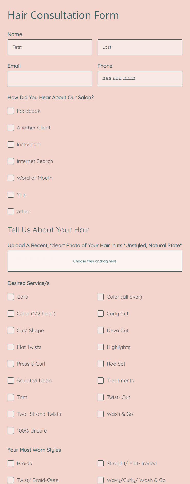 - Hair History & Type: Natural hair color, previous treatments, current texture, thickness, length, any concerns like dryness or oiliness.