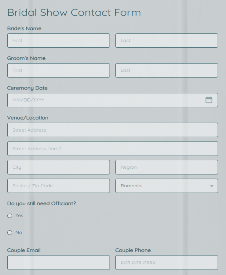 To further encourage submissions, consider integrating an incentive directly with your form or as a benefit of completing it. This could be anything from entering them into a draw for a prize related to your services to offering an exclusive bridal show discount redeemable upon contact. Such incentives not only boost conversion rates but also provide an immediate value proposition, making the act of filling out the form feel more rewarding for the couple.