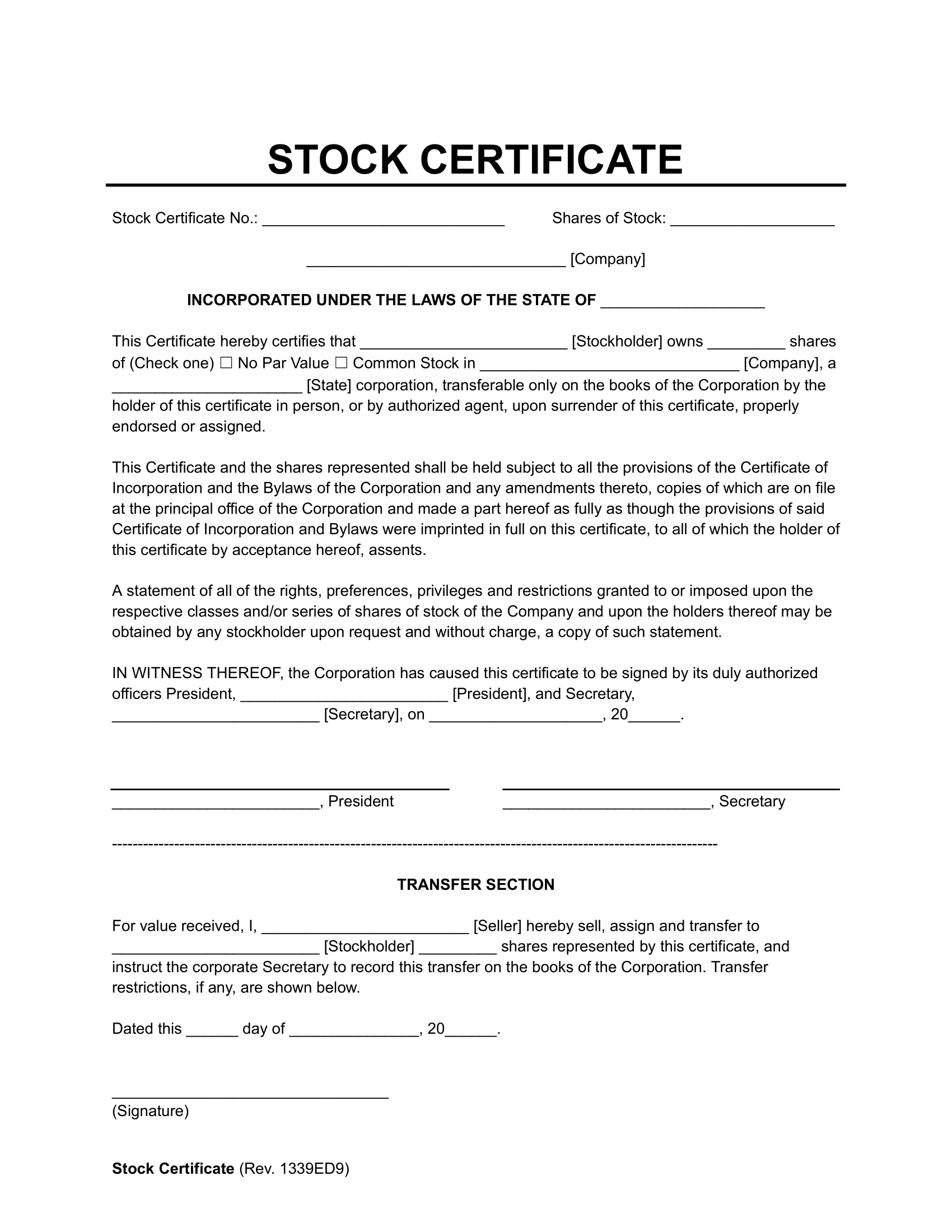 - The class of shares (e.g., Common Stock, Preferred Stock) and any specific designations.