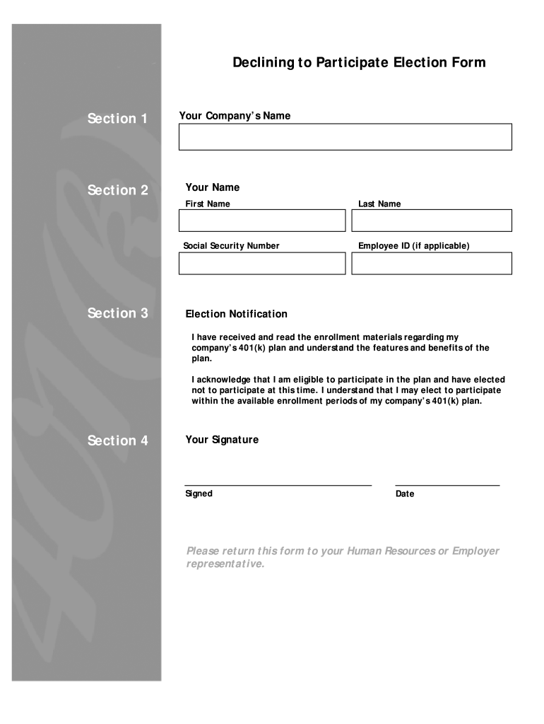 - Company Representative Acknowledgment (Optional): Space for an HR or manager signature, especially if the opt-out requires company action.