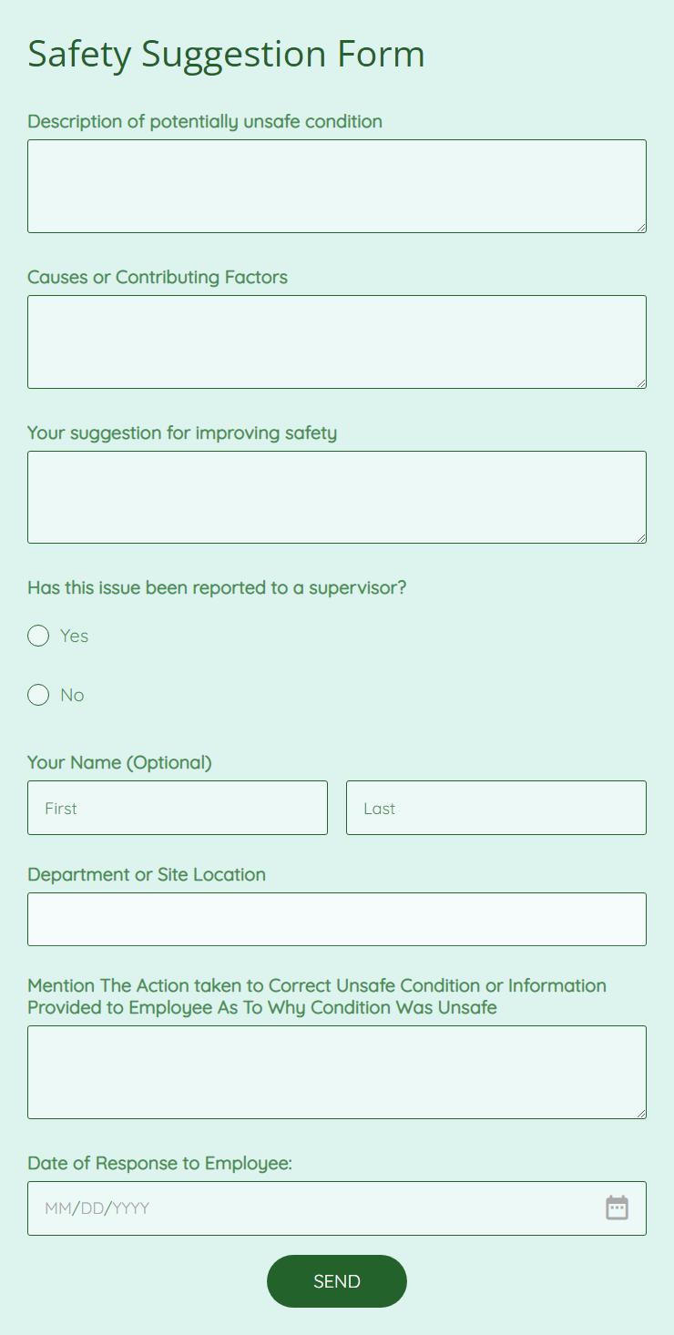 • A clear, inviting title like “Employee Safety Suggestion Form” and brief instructions.