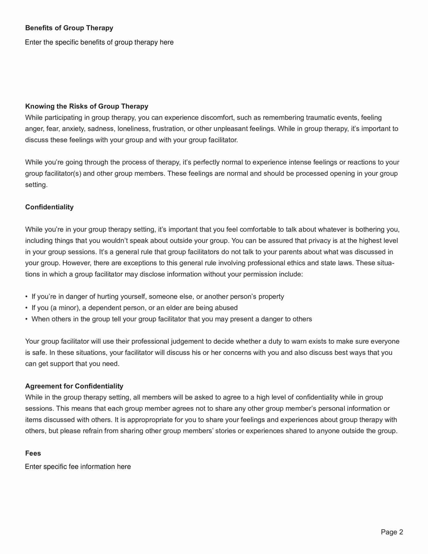 - Confidentiality Agreement: Explaining the importance of confidentiality among group members and the therapist, including any limitations to confidentiality (e.g., duty to warn).