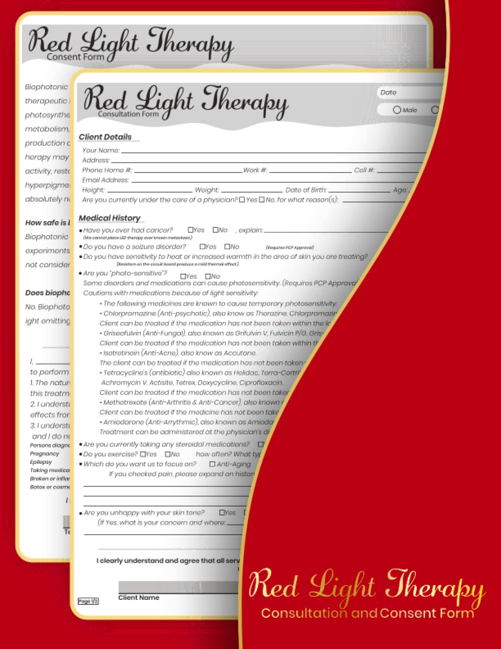Informed Consent & Policies: A clear statement outlining the nature of light therapy, potential risks and benefits, privacy policies, cancellation policies, and client acknowledgment of understanding and agreement.
