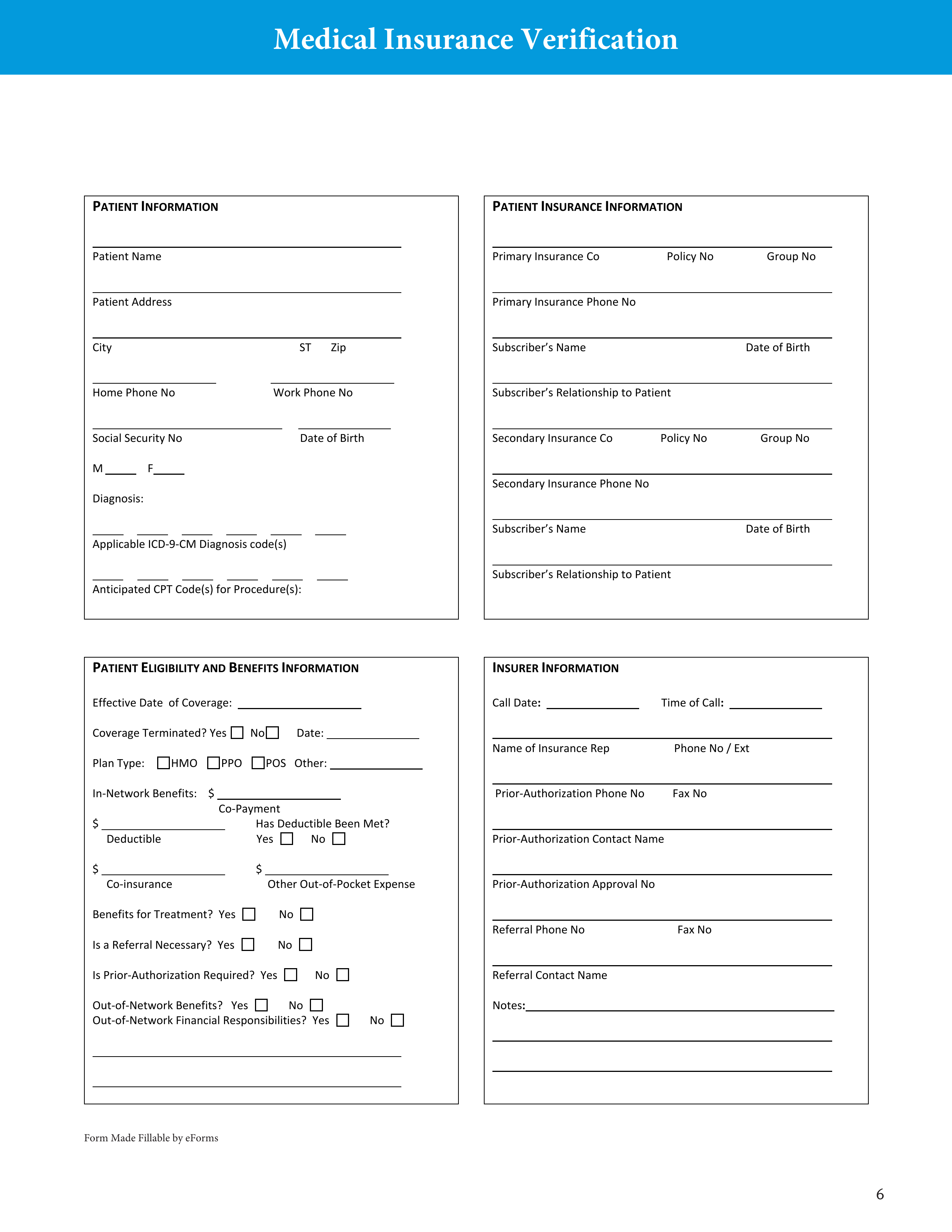 - Verification Agent Details: Name of person verifying, date of verification, insurance representative’s name and reference number.
