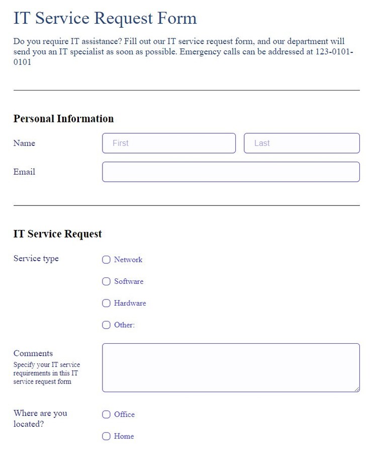 - Type of Service Needed (e.g., new account, network access, hardware installation, troubleshooting)
