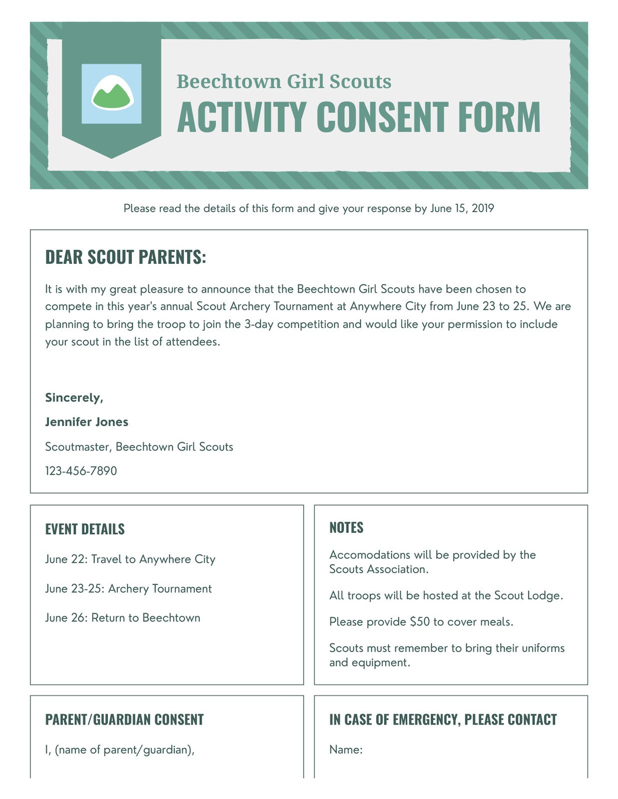 • Parent/Guardian Consent and Signature Line: A clear statement of consent for participation, emergency medical treatment, and acknowledgment of risks, followed by signature and date lines.