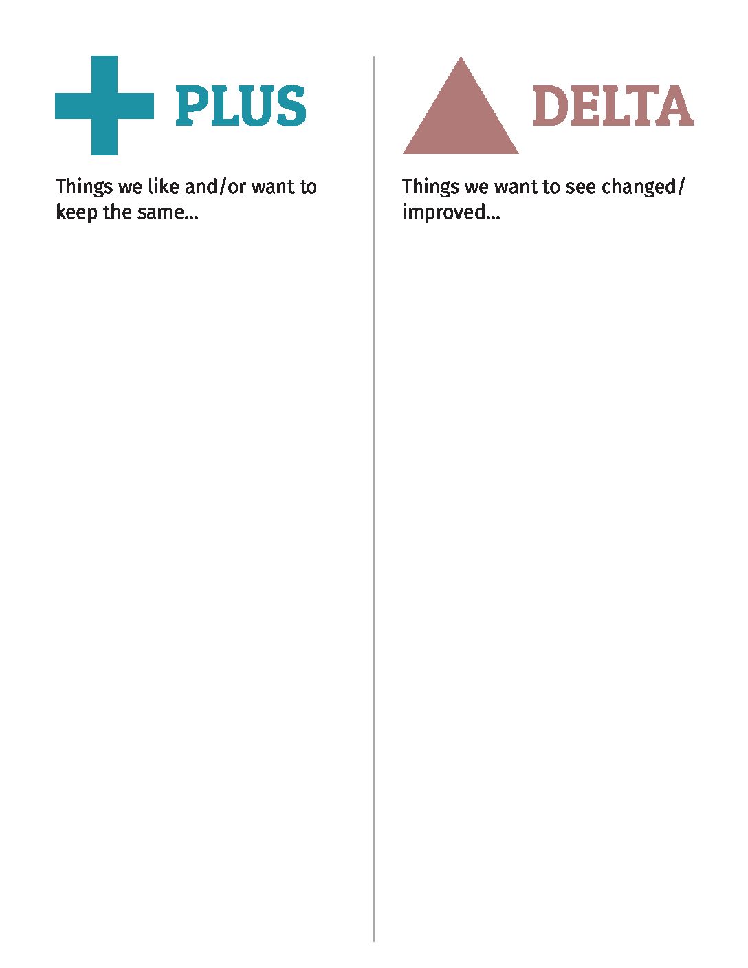 - “Plus” section: What went well, specific examples, successes to celebrate.