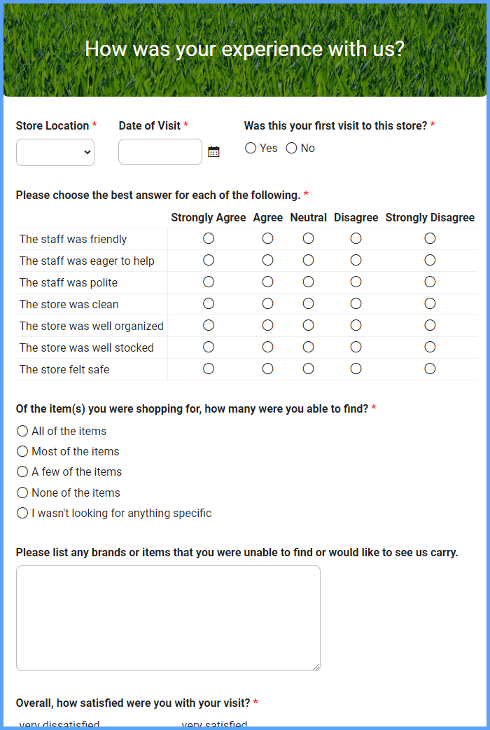 • Specific service questions (e.g., staff helpfulness, product availability, store cleanliness, ease of navigation)