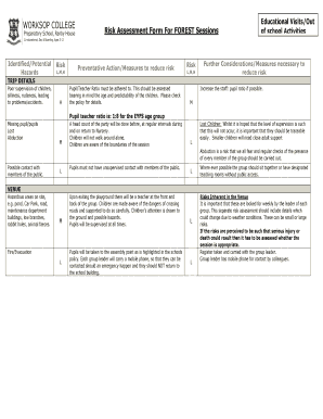 • Sections for identifying potential hazards (e.g., travel, venue, activities, supervision, health).